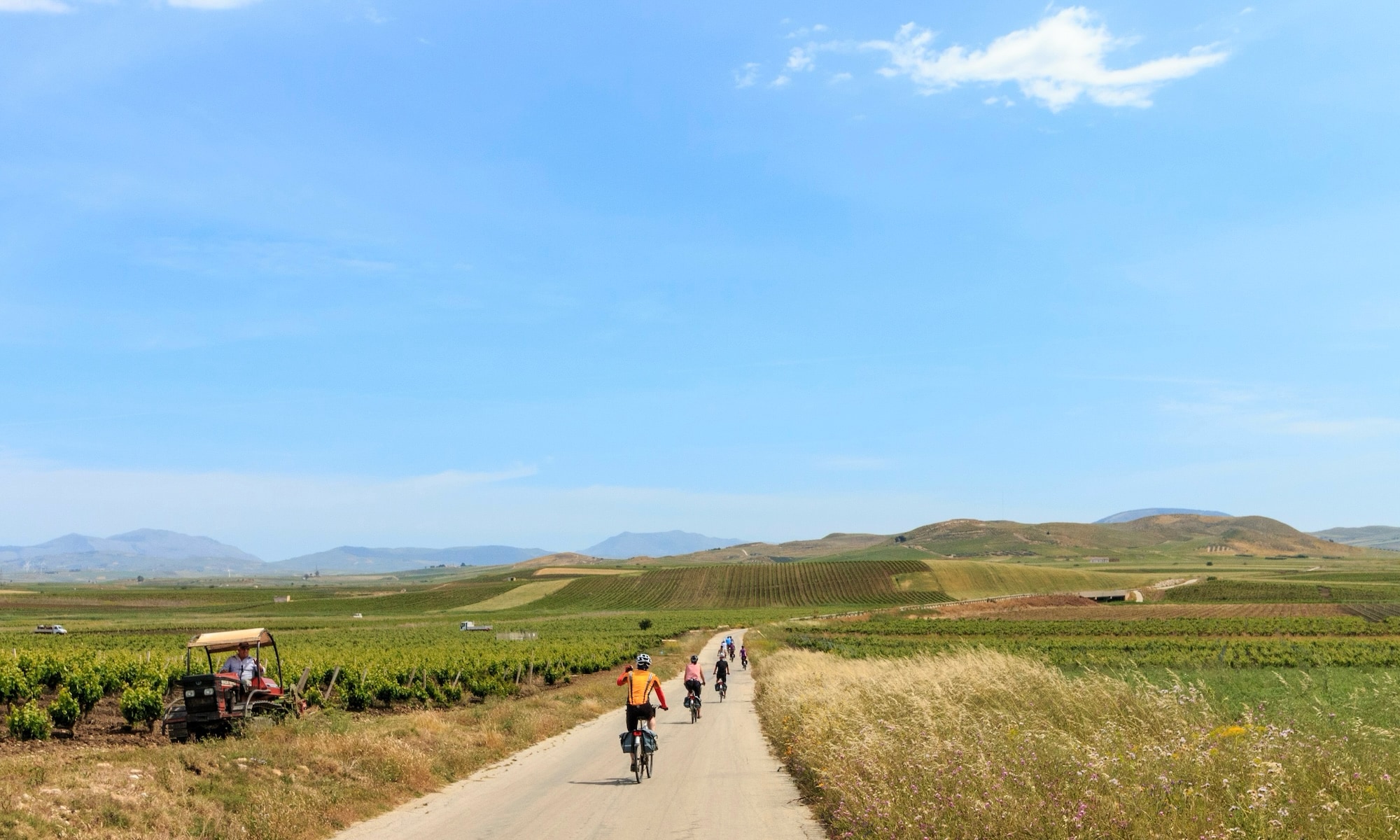 Du lämnar den livliga kuststaden Marsala bakom dig och cyklar inåt landet. Vägen går gradvis uppför genom ängsmark och vetefält som vajar i vinden. Då och då dyker du på ett och annat gårdshus i detta glest befolkade men mycket vackra område vars färgpalett skiftar med årstiderna. Under våren är fälten gröna för att sedan bli guldgula under sommaren innan de övergår i ockra och brunt under hösten. Slutmålet är en liten familjeägd gård som serverar egenodlade och hemlagade Sicilianska specialiteter. Här bor du i två nätter.