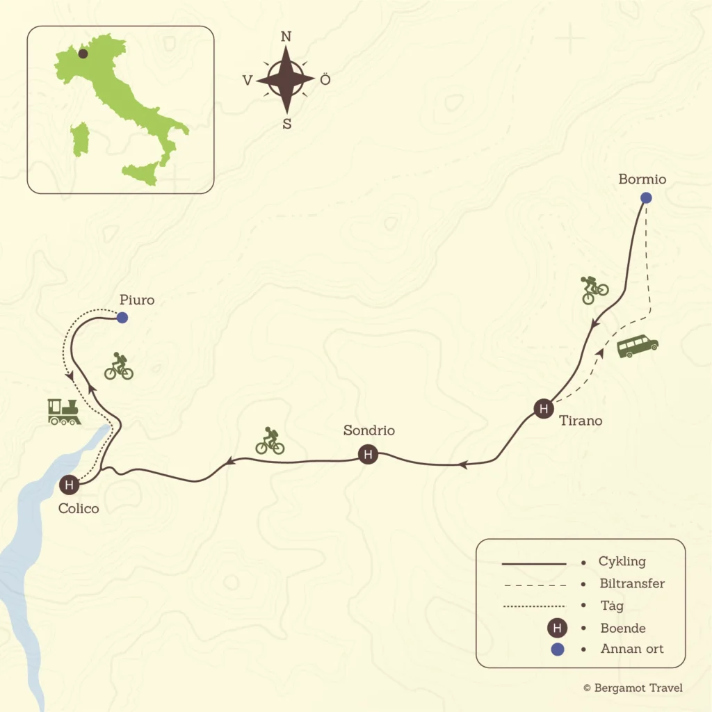 Idag ger du dig ut längs en annan cykelled, Valchiavenna, en led på låg höjd som börjar i Colico och går hela vägen till den Schweiziska gränsen. I denna delen av Italien kan du se sammanblandningen av två olika kulturer vilket har skapat en tydlig centraleuropeisk karaktär. Du följer leden till Chiavenna där du kan fortsätta till den lilla byn Piuro. Här hittar du arkeologiska utgrävningar, vattenfallet Acquafraggia och det magnifika Palazzo Vertemate som är en av de vackraste historiska byggnaderna i Lombardiet. Efter besöket tar du tåget tillbaka till Colico.