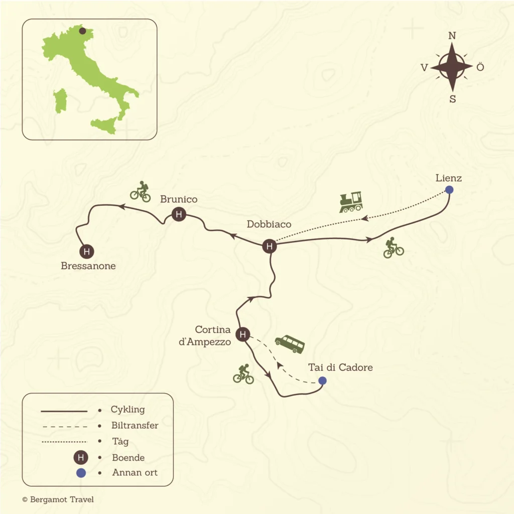 Du börjar resan i den legendariska alporten Cortina d’Ampezzo varifrån du cyklar med enastående vyer till Tai di Cadore. Därefter tar du dig till Dobbiaco via flera fina utsiktpunkter där du bland annat kan beundra de berömda Tre Cime di Lavaredo. Följ sedan den kända cykelleden längs floden Drava till Lienz i Österrike innan du cyklar vidare in i Pusterdalen mot Brunico. Sista dagen följer du en naturskön cykelväg till Bressanone där resan avslutas.