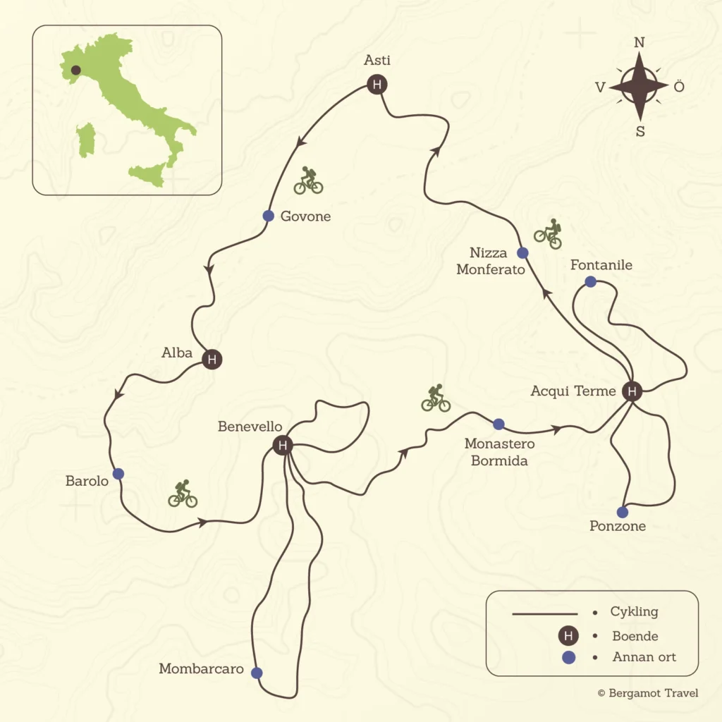 Från Benevello gör du en fin rundtur längs en väg som slingrar sig genom det öppna landskapet och täta hasselnötsskogar. Du har fantastisk utsikt från Mombarcaro som är Alta Langhes högst belägna by på 900 meters höjd. Genom Bormidadalen, på en vacker liten landsväg, cyklar du till den berömda Spa-staden Acqui Terme. Längs vägen passerar du flera muromgärdade byar och slott. Du besöker också charmiga, historiska städer som Asti med sina labyrinter av kullerstensgränder och palats byggda i gul kalksten. På de små torgen, under de gamla arkaderna, hittar du inbjudande skuggiga terasser. Avslutningsvis cyklar du tillbaka till tryffelstaden Alba där resan slutar.