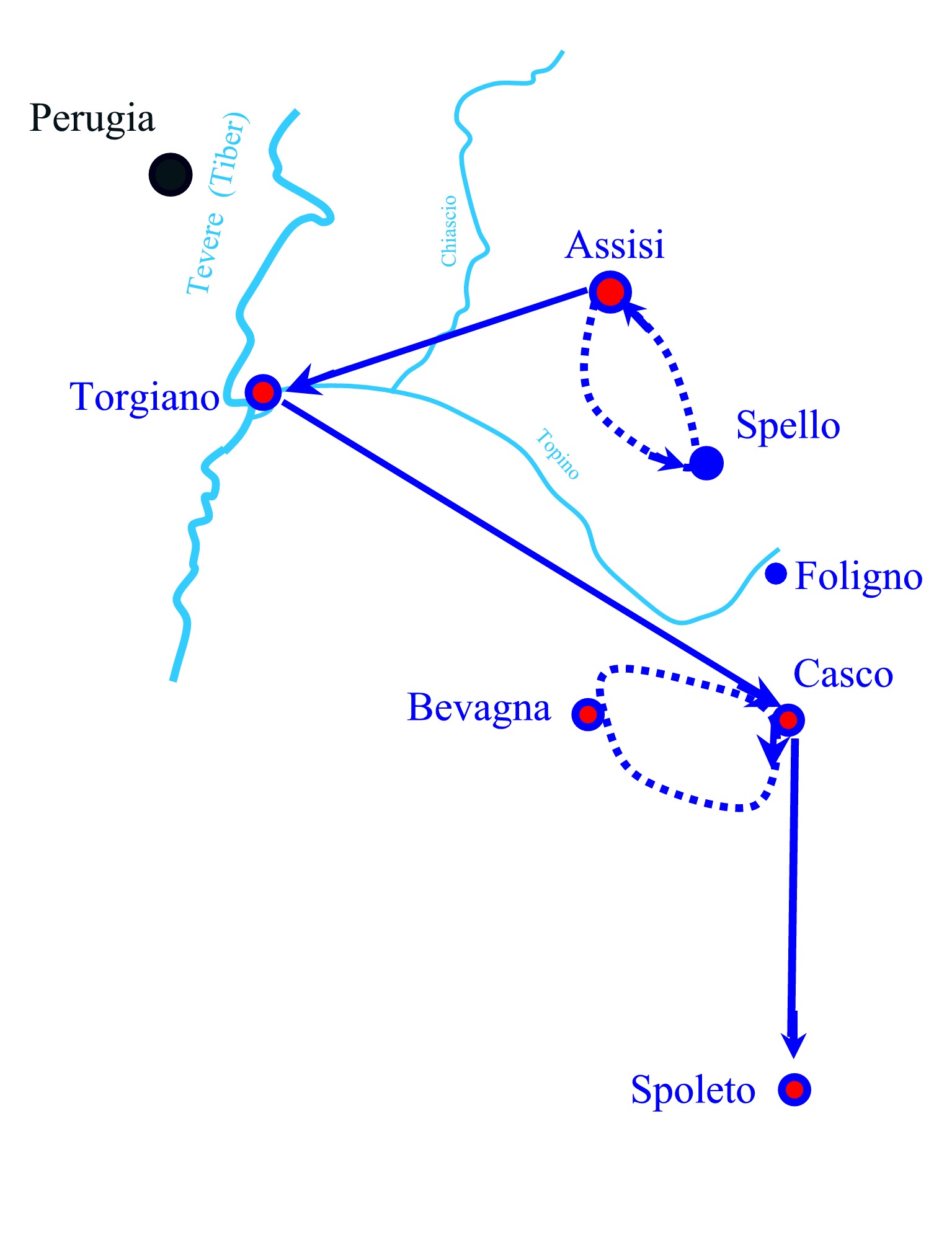 Väljer du programmet på 5 dagar/4 nätter så hoppar du över dag 2 och istället för att cykla till Casco dell´Acqua cyklar du till Bevagna där du bor en natt. Programmet ser ut så här: